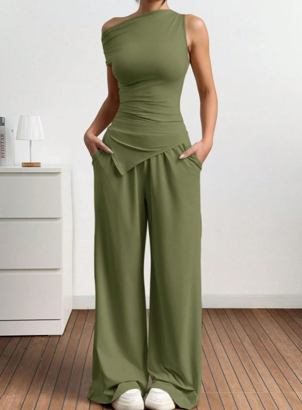 Deze chique en comfortabele 2-delige dames set is perfect voor zowel woon-werkverkeer als casual gelegenheden. De set bestaat uit een stijlvolle asymmetrische top en een bijpassende broek in een effen kleur, wat zorgt voor een moderne en minimalistische uitstraling. Dankzij het zachte materiaal en het flatterende ontwerp biedt deze outfit zowel draagcomfort als elegantie. Ideaal voor een moeiteloze, verzorgde look van kantoor tot weekend!