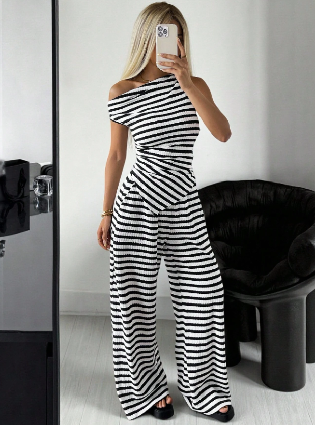 Maak een stijlvol statement met deze opvallende 2-delige dames set, bestaande uit een asymmetrische off-shoulder top en een bijpassende wijde broek. Het zwart-witte streeppatroon zorgt voor een moderne en chique look, perfect voor zowel casual als semi-formele gelegenheden. De flatterende pasvorm en zachte, geribde stof bieden ultiem comfort met een trendy uitstraling. Ideaal voor een dagje uit, een diner of een fashionable werkdag. Combineer met sandalen of hakken voor een complete outfit!